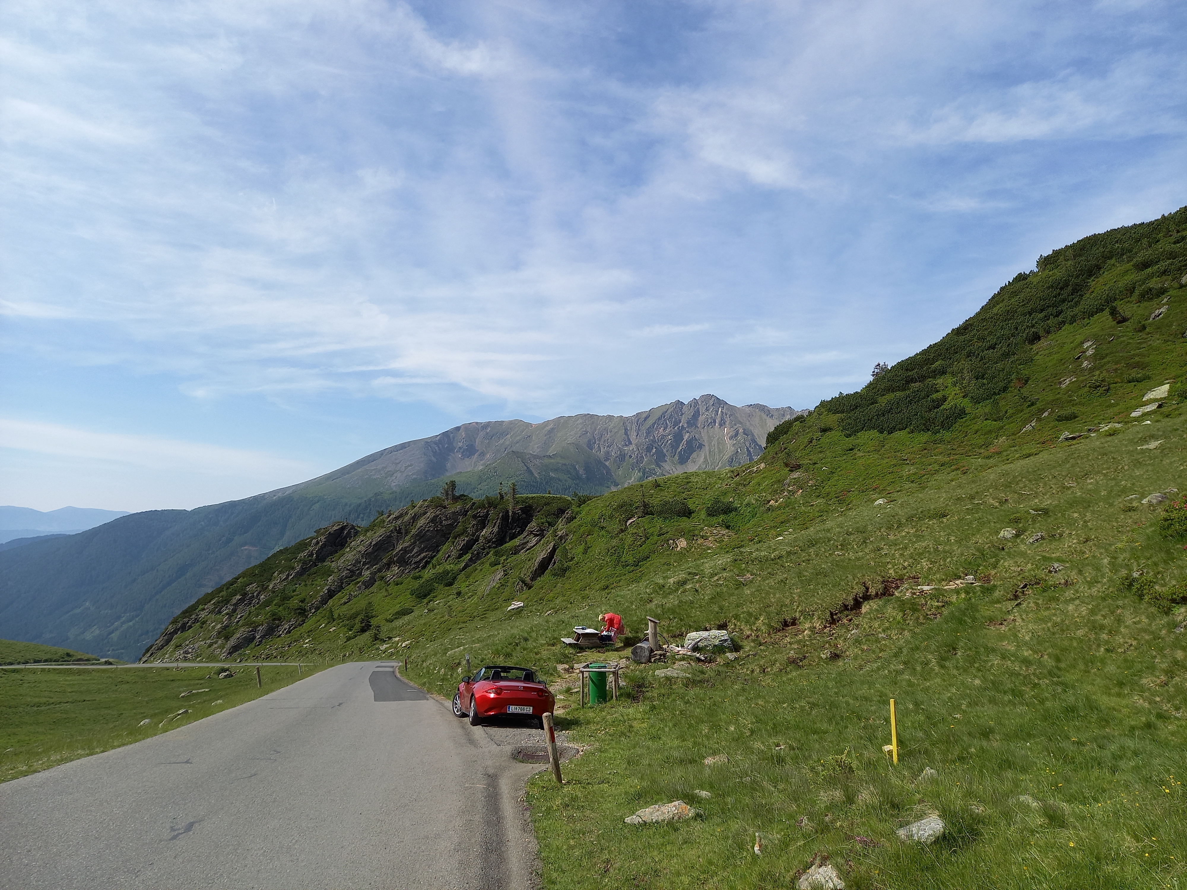 Ehelyett fél kilencig aludtam. Gyanús beszélgetést hallottam, és szétnézve egy idős párt láttam az asztaloknál reggelizni. Egy metálbordó MX-5-tel érkeztek :) Amikor átmentem a forráshoz mosakodni, a néni kedvesen reggelivel kínált volna, de már minden elfogyott. Tejet tudott volna csak adni :) Vajon mit gondolhatott rólam? Állítólag hallotta a kiejtésemen, hogy magyar vagyok. Szerintem a rendszámom is segíthetett neki :) Bad Ischl-ből jöttek.