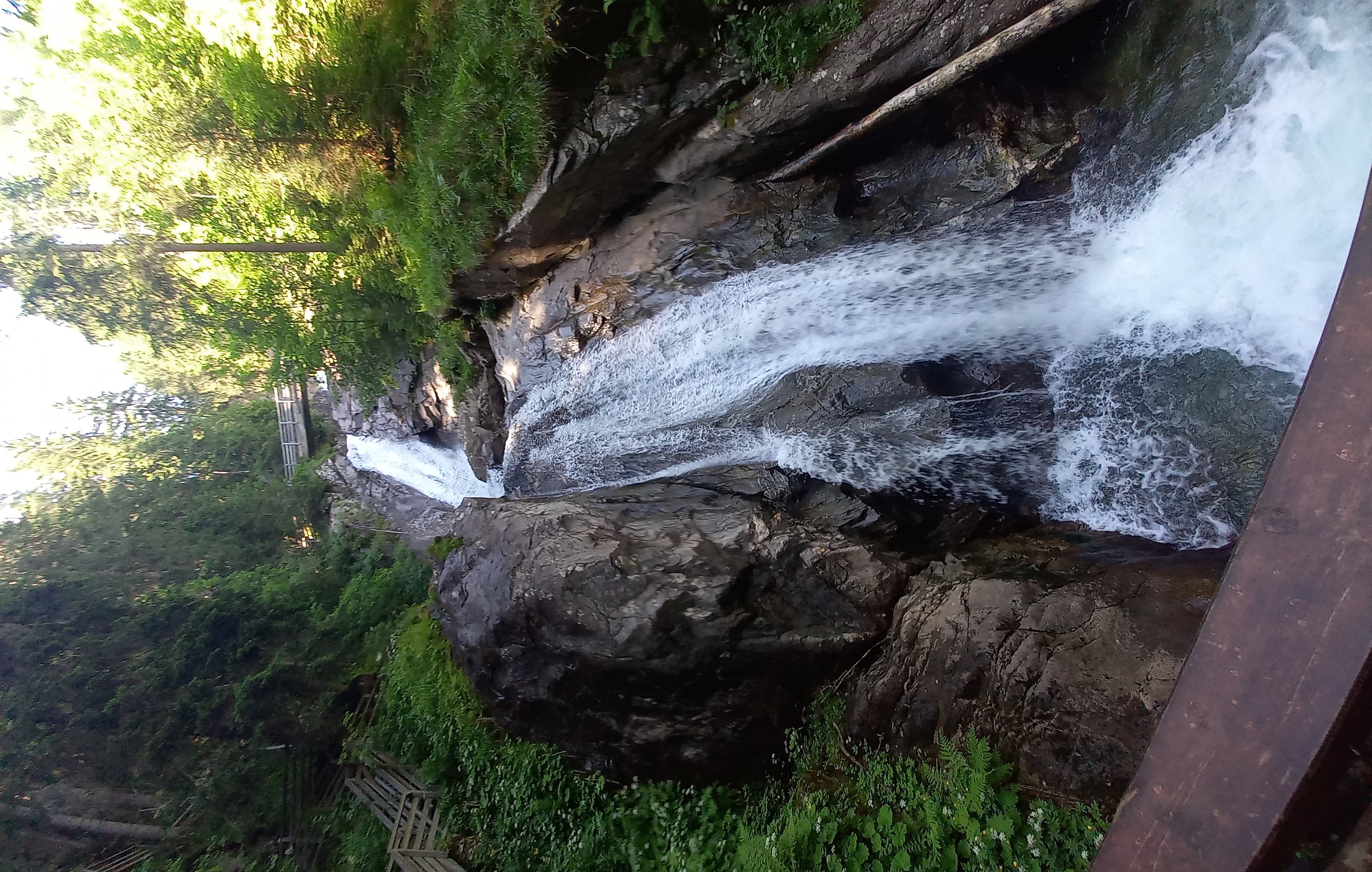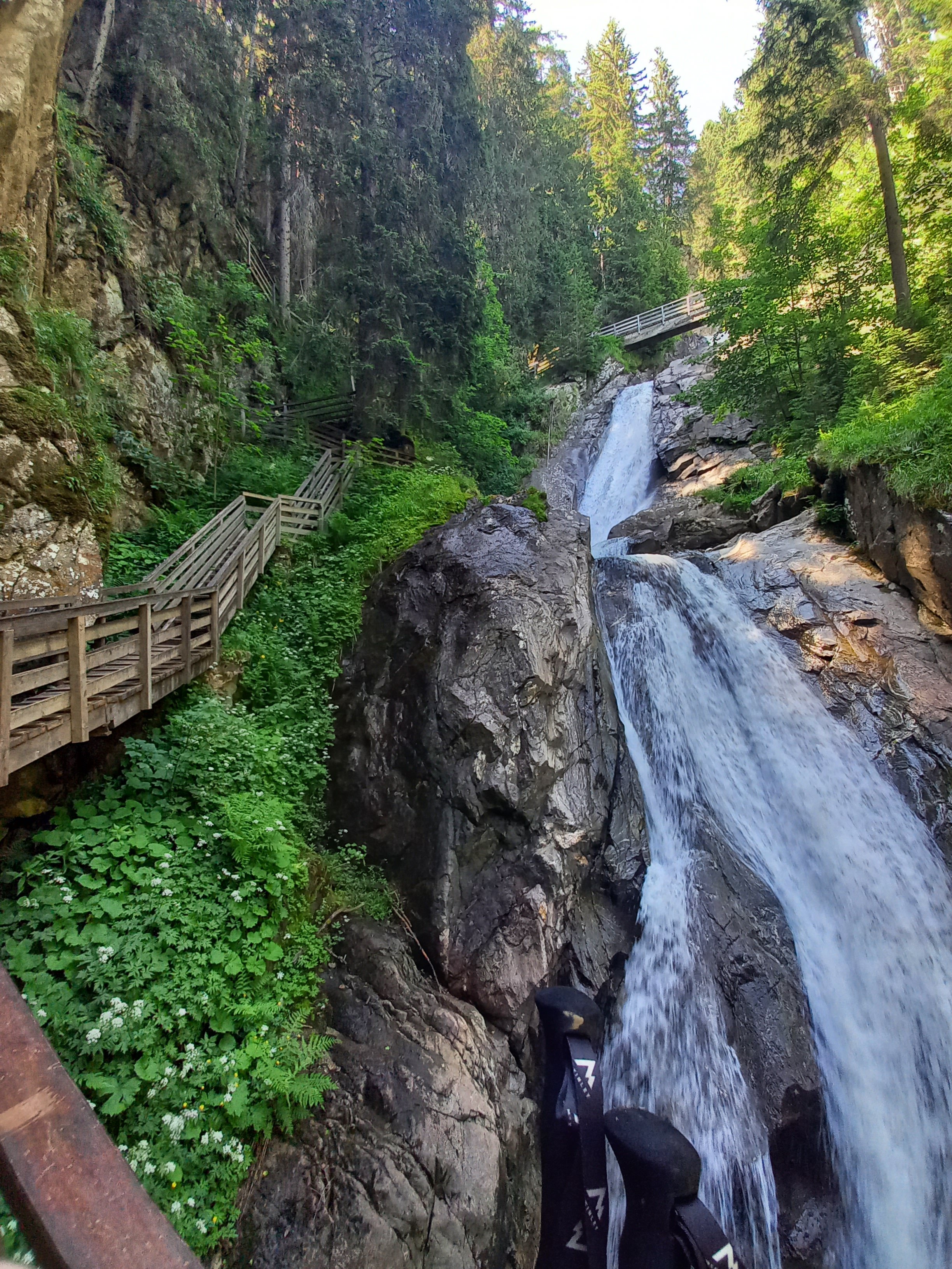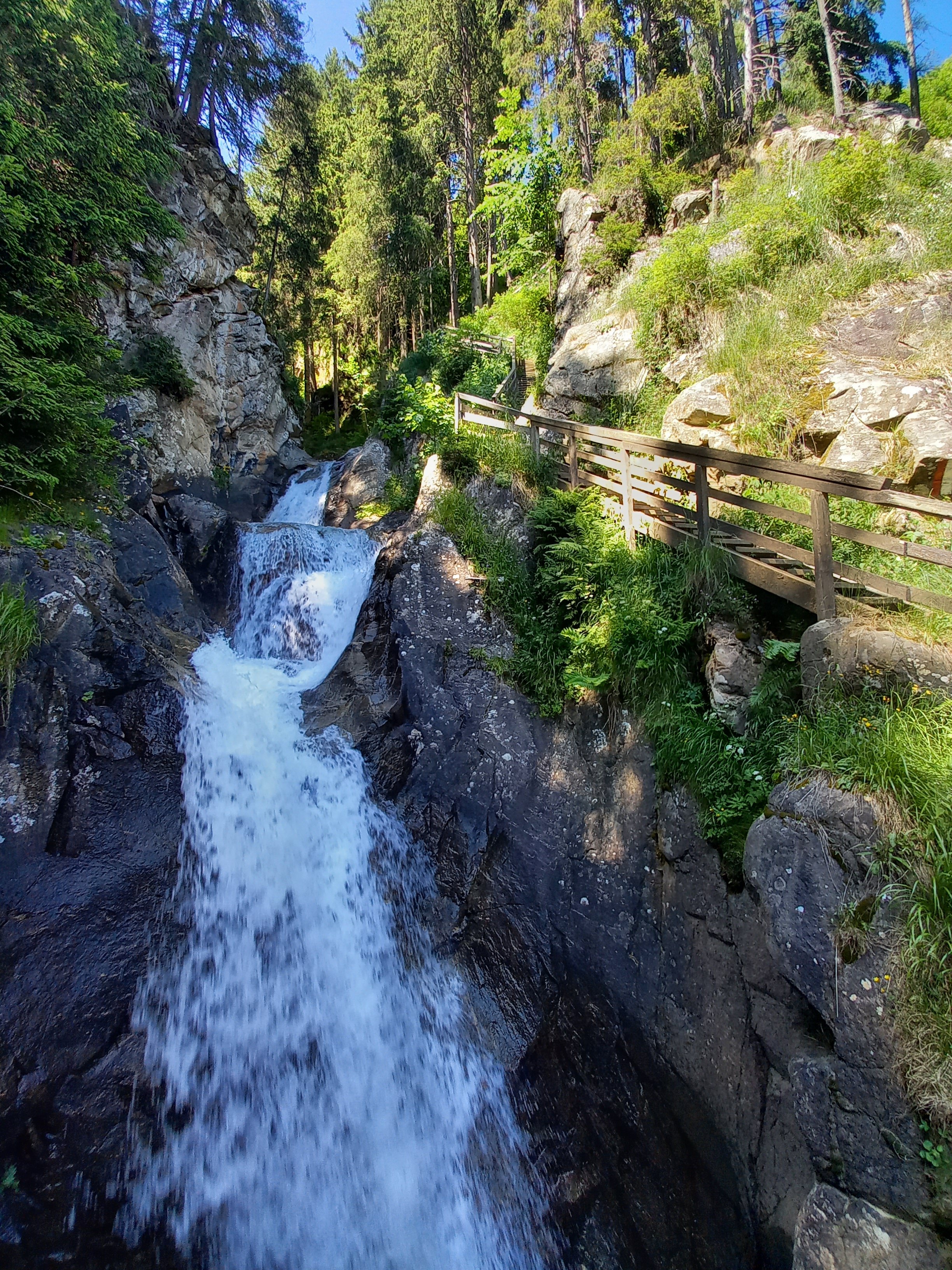 Én is megérkeztem a Günster vízeséshez. Pofátlanul felmentem a Gasthof parkolójába, mert nem volt kedven a tűző napon gyalogolni. Iszonyú meleg volt. Összepakoltam, és elindultam. Megkockáztattam a szandált. Lementem a patakhoz összevizezni magam, ki tudja, lehet-e majd később. Innen egy részen az erdőben haladt az út, majd lépcsőkön. Még a sziklák közt pancsoltam kicsit, aztán jöhet az emekedő. Rögtön az elején lehetett látni szinte az egész vízesést. De lemenni sehol nem lehetett. A hídról fotóztam párat, aztán még feljebb másztam. Nem kellett volna. A vége le volt zárva :( Lefele erősen remegtek már a lábaim :( Megálltam egy padnál pihenni és csodálni a felhőképet. Tökéletes volt! Sajna nem volt téereőm megnézni, hogy merre repülnek.