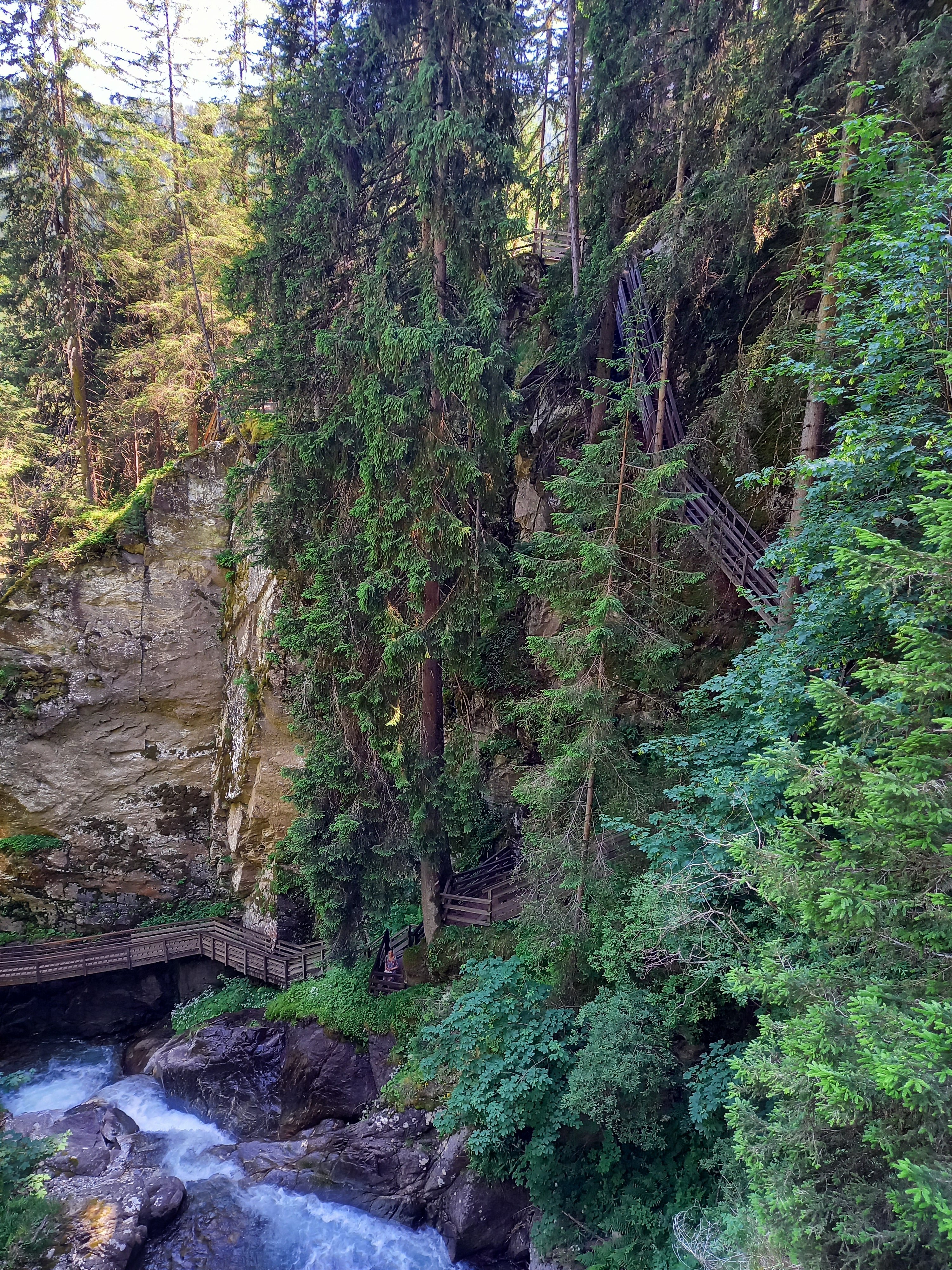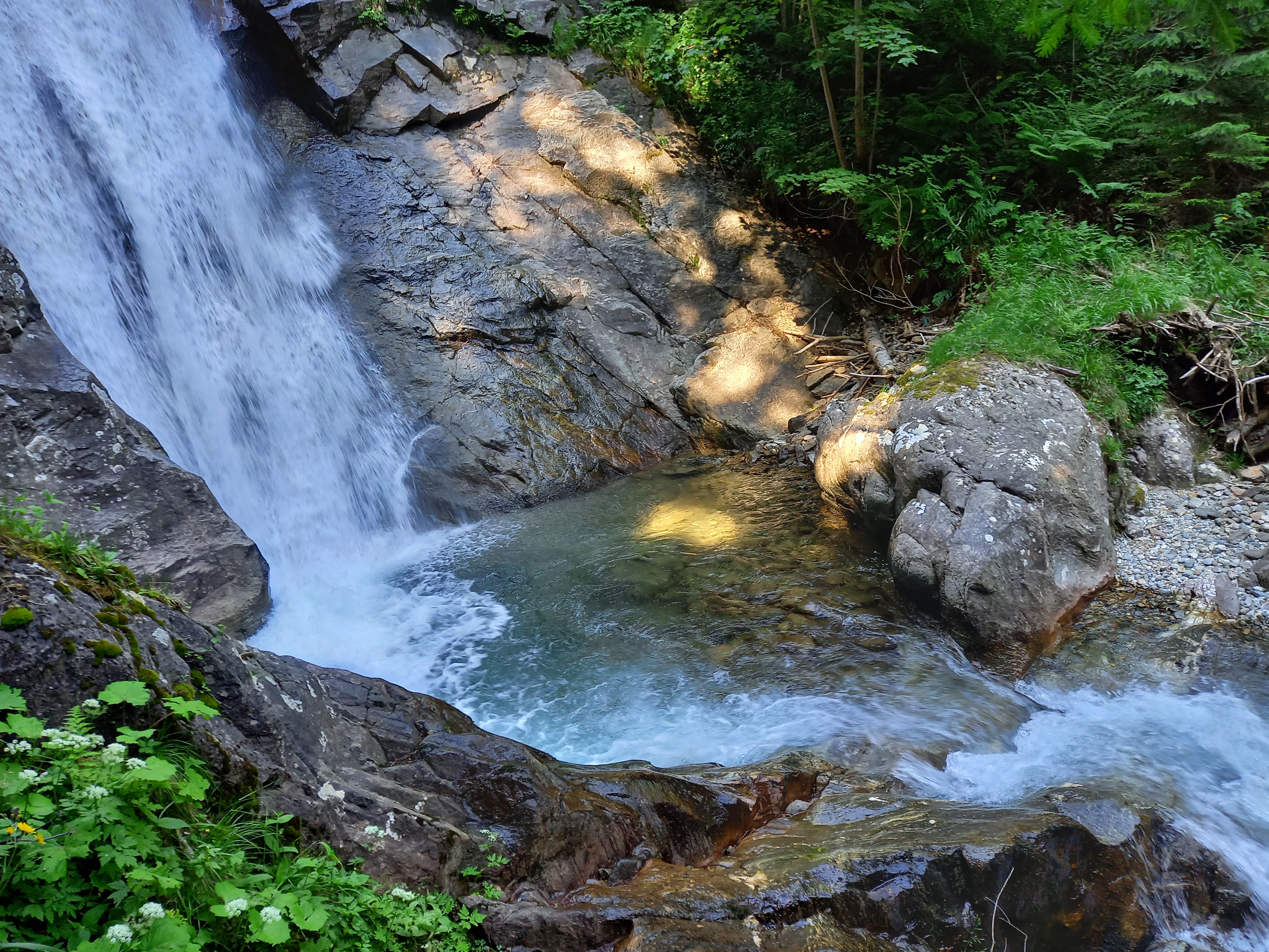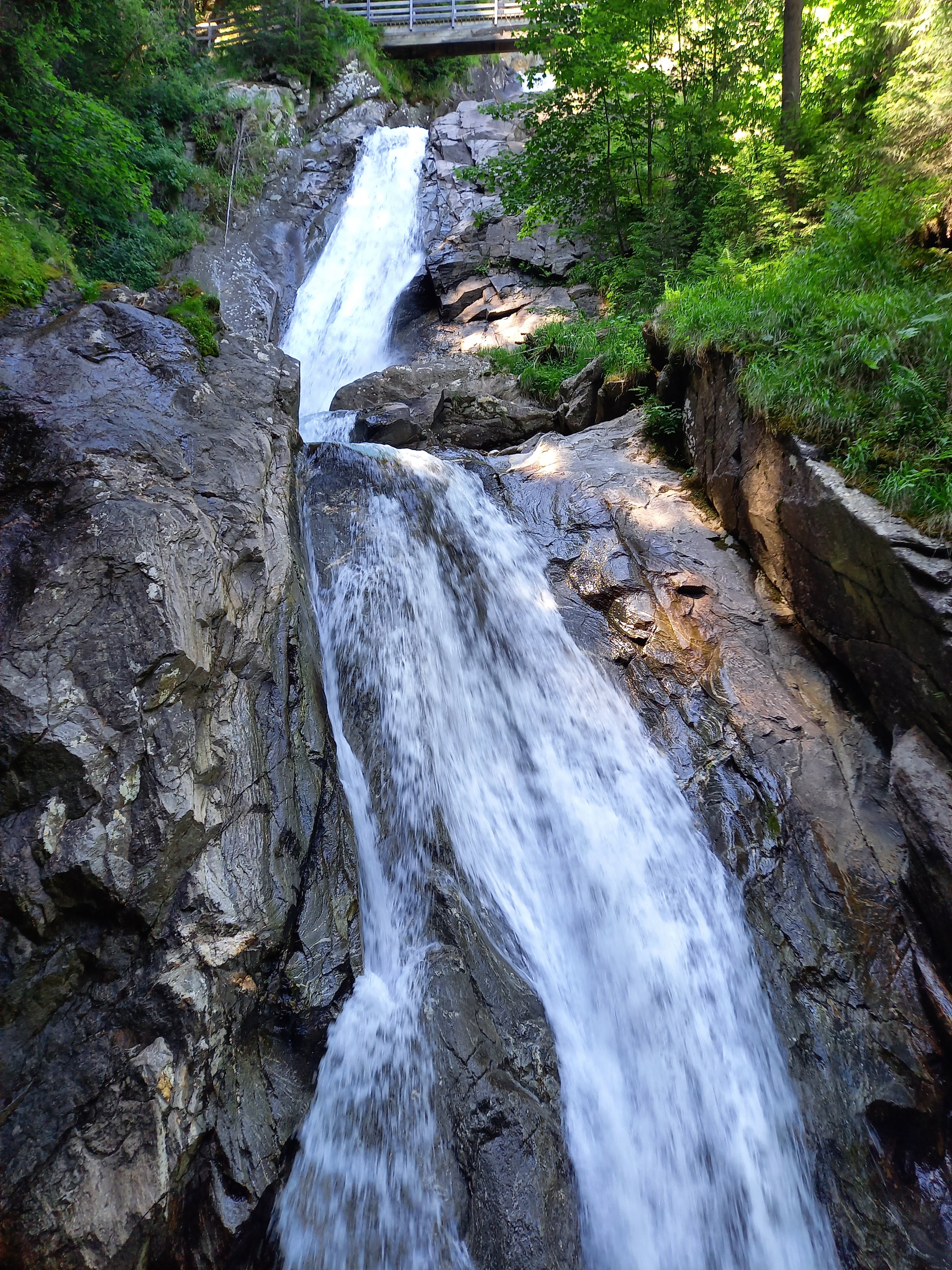 Én is megérkeztem a Günster vízeséshez. Pofátlanul felmentem a Gasthof parkolójába, mert nem volt kedven a tűző napon gyalogolni. Iszonyú meleg volt. Összepakoltam, és elindultam. Megkockáztattam a szandált. Lementem a patakhoz összevizezni magam, ki tudja, lehet-e majd később. Innen egy részen az erdőben haladt az út, majd lépcsőkön. Még a sziklák közt pancsoltam kicsit, aztán jöhet az emekedő. Rögtön az elején lehetett látni szinte az egész vízesést. De lemenni sehol nem lehetett. A hídról fotóztam párat, aztán még feljebb másztam. Nem kellett volna. A vége le volt zárva :( Lefele erősen remegtek már a lábaim :( Megálltam egy padnál pihenni és csodálni a felhőképet. Tökéletes volt! Sajna nem volt téereőm megnézni, hogy merre repülnek.