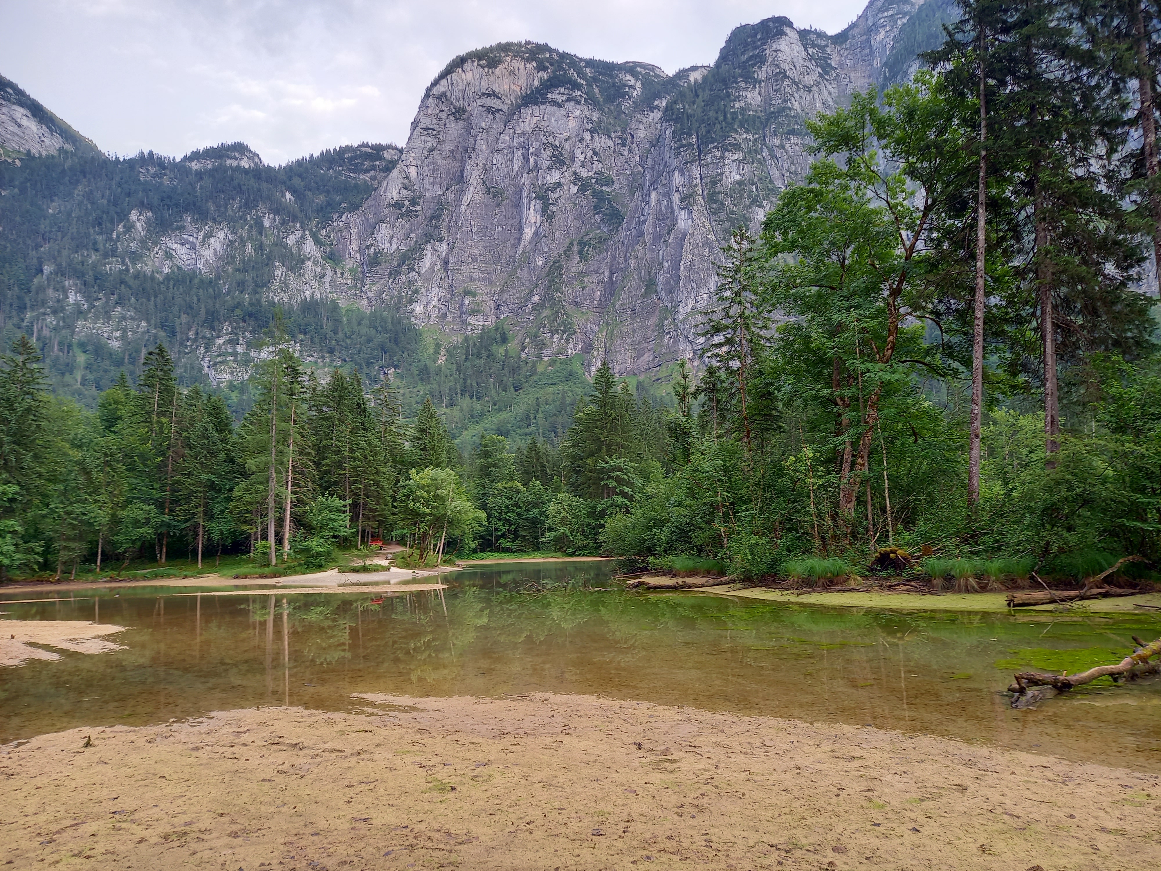 Még egy séta belefért, és tisztult az idő. Közben egyre erősödött a migrénem, ezért bevettem rá a bogyót. A Koppenkarstein hívogatott :) Ugyan elég sokára tudtam elindulni, mert újra és újra rákezdett az eső… Pedig már láttam a falat napsütésben is :) Csak 15 perc séta volt a Koppenwinklsee. Vagy inkább mocsár. Az volt az érzésem, hogy a tó iszapjában sétálok. De a kilátás kárpótolt :) A végére a szerencsésen migrénem alábbhagyott.