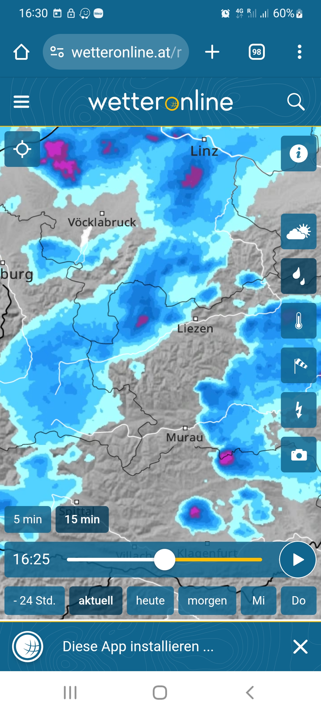 A vihar után sehol senki. Néztem egy radarképet, úgy látszott, itt már vége. Még naplementéig beleférek kényelmesen. Kipakoltam a kajakot (jó messze volt a part), és összeraktam. Már vizen volt az orra, az egyik skaget is betettem, mikor elkezdett csöpögni az eső :( ÉNy felé sötét felhők voltak. A friss radarképen pedig Salzburgig összefüggő eső :( Hát, ez nem jött jókor. Legalább tíz percet várhatott volna, hogy evezőt foghassak. Hát, nem. Ehelyett szedhettem szét az esőben, és cipelhettem mindent vissza. Csöpögősen, a takaróm mellé. A végén már igencsak kellett sietnem, és így is eléggé eláztam. A kocsiban fűtve próbáltam hajat szárítani.