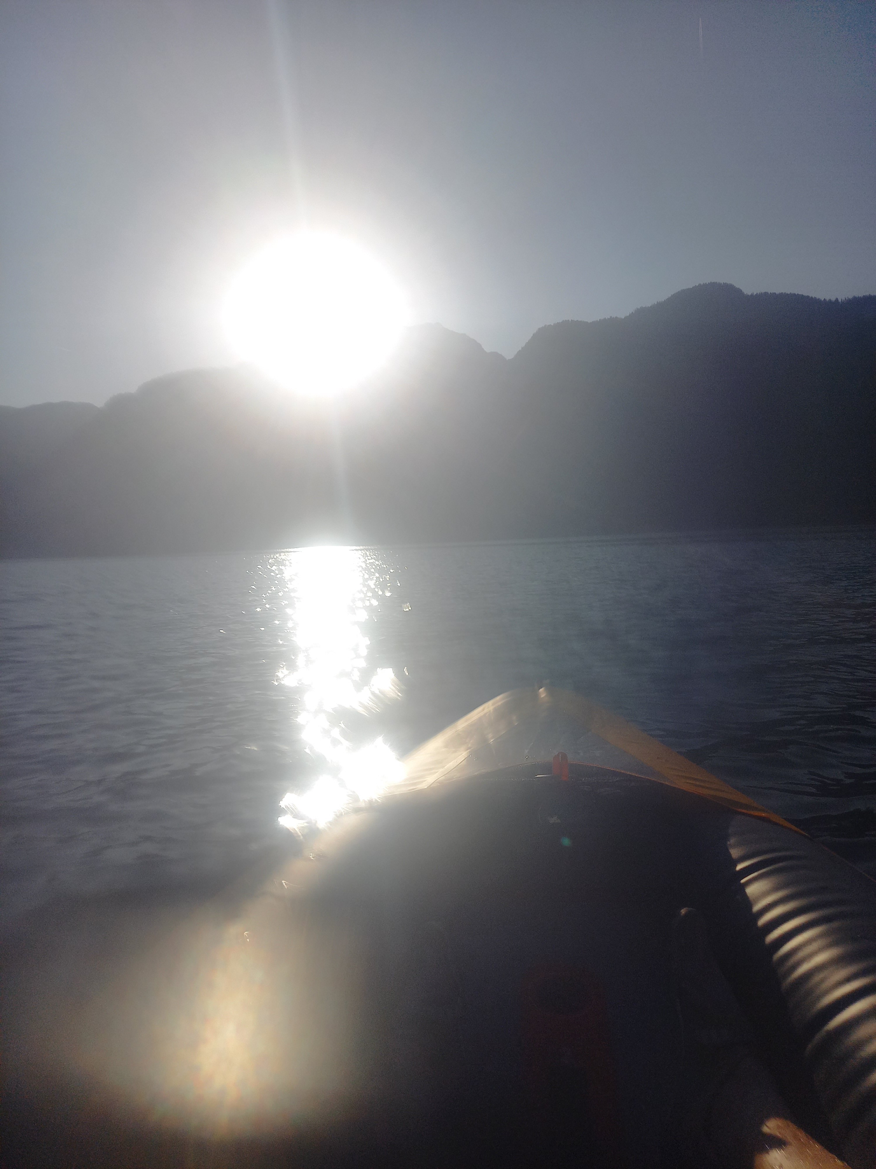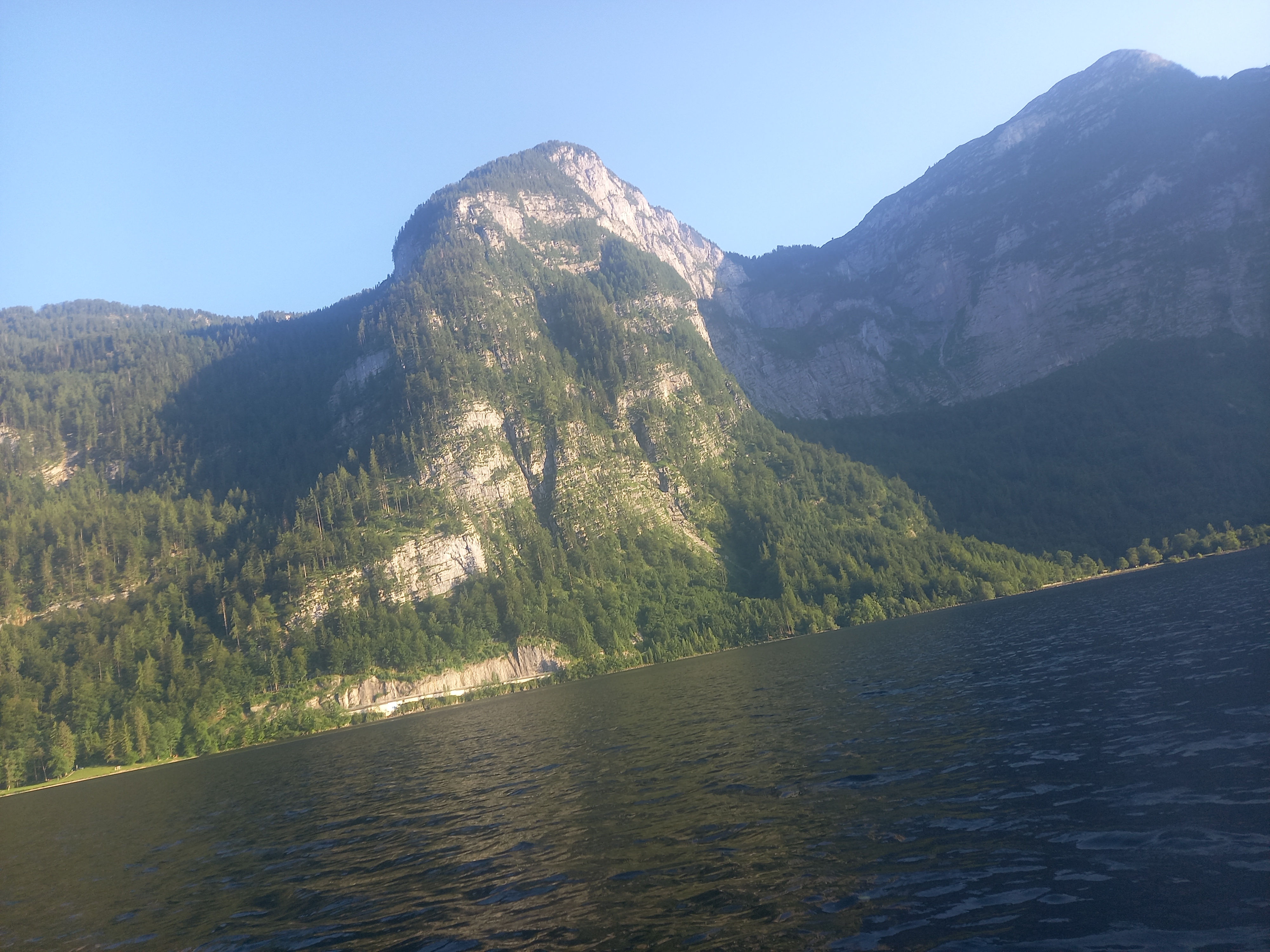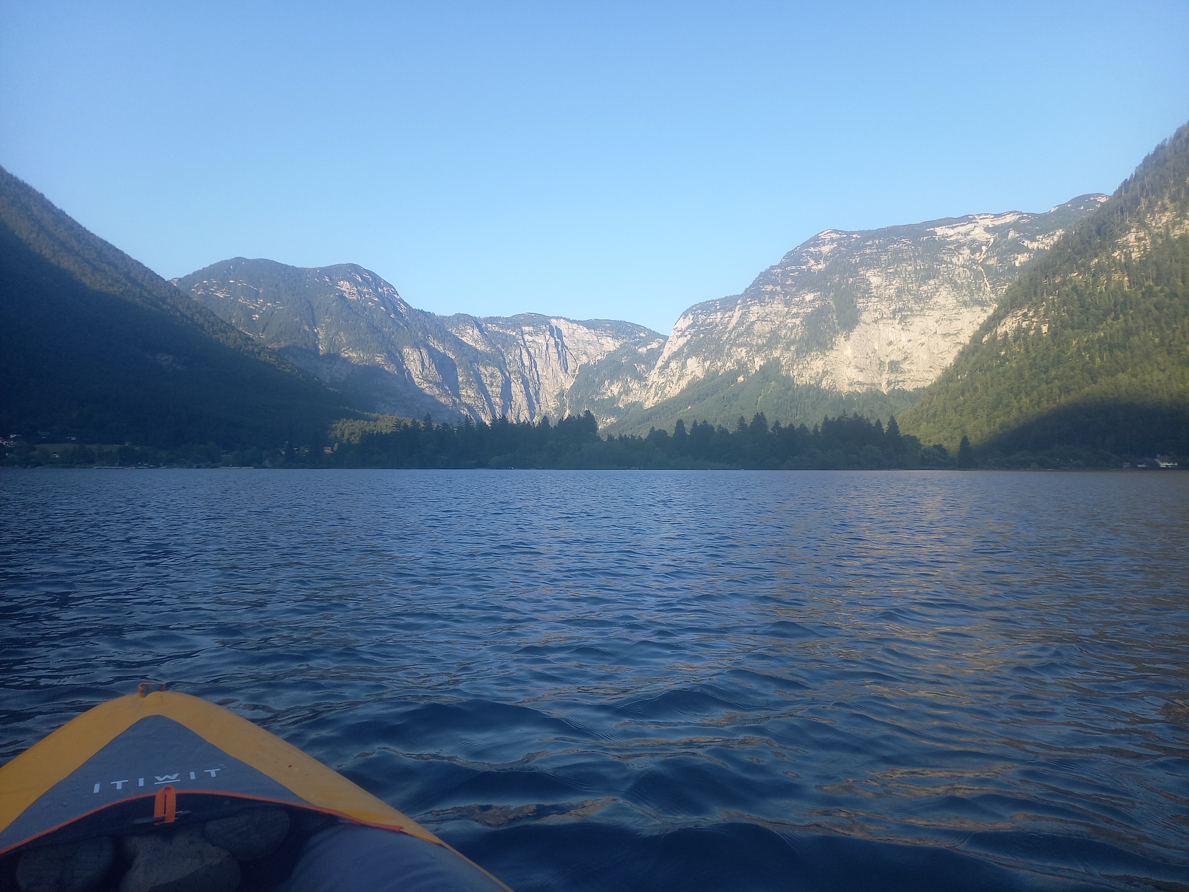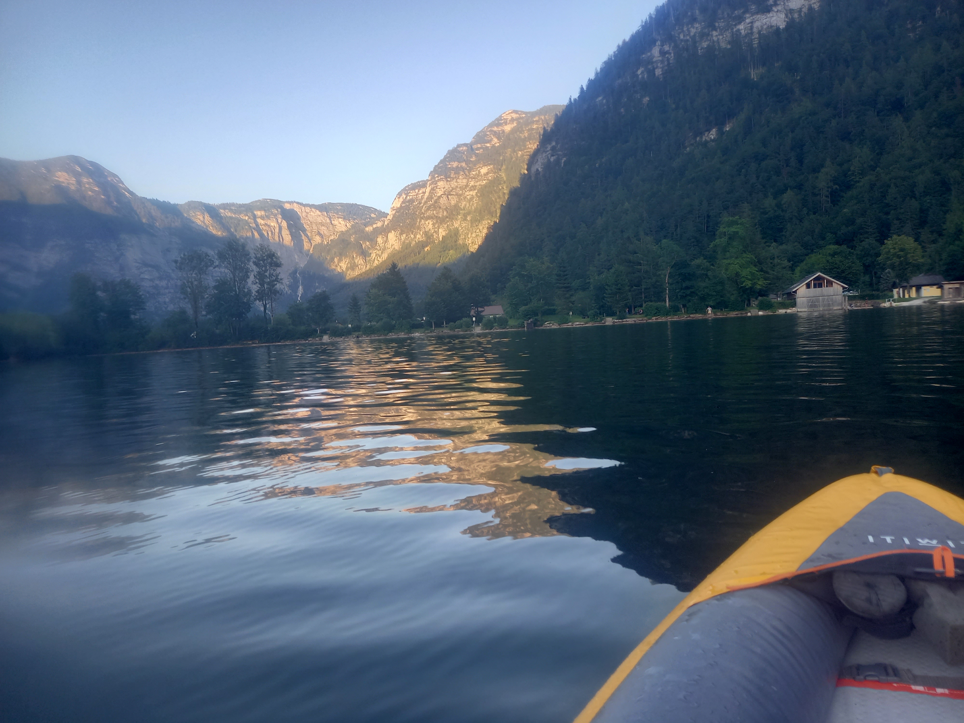 Napközben egyre erősödött a völgyszél. Már azt terveztem, hogy maradok még egy éjszakát, és holnap hajnalban megyek ki kajakozni. De 16:00-ra Újpesten kellene lennem, az csak nagyon szűken férhet bele. Szerencsére elkezdett enyhülni a szél. Már eléggé kiürült a strand, mire összeraktam a kajakot. Amint vízre tettem, pár evezőcsapás után lement a nap a Salzberg mögé. Persze, Krippensteint sütötte még, és a Seewandra is szép volt kilátás. A hallstatti vízesést csak azért találtam meg, mert tudtam, hogy hol keressem. Áteveztem a túloldalra, bár ott nem szabad kikötni. Visszafele mégegyszer megcsodáltam a sziklafalakat, aztán kikötés helyett inkább megnéztem a Traunt. Ezt előzőleg kihagytam. Pár napja volt hír, hogy a Balatonon helyenként tilos fürdeni. Hát, meglepő módon a Halstätter See is elég moszatos volt. Plusz a vihar és a völgyszél pont erre az oldalra sodort minden koszt és falevelet. A túloldalon, a szélcsendes részen szebb volt.