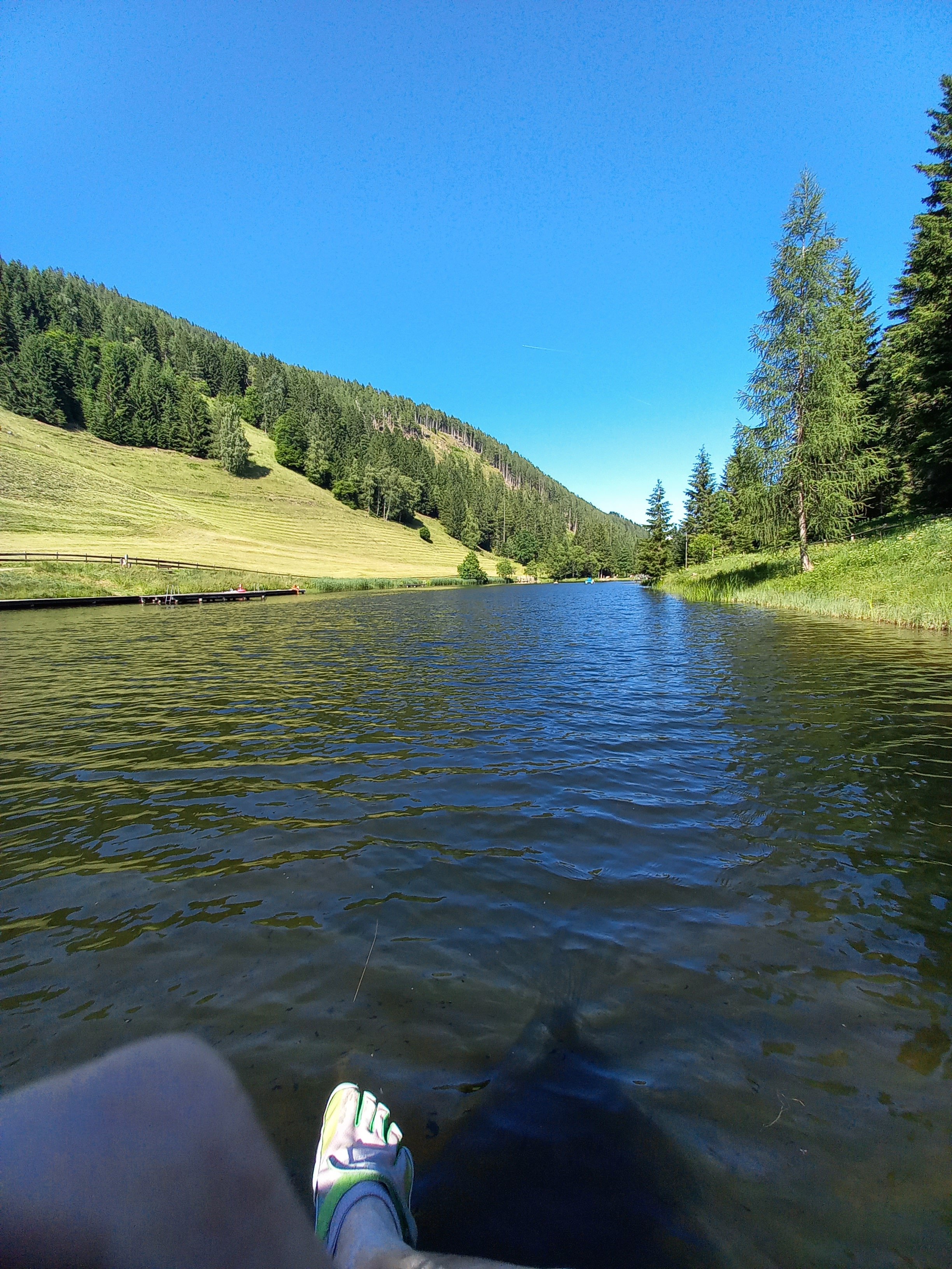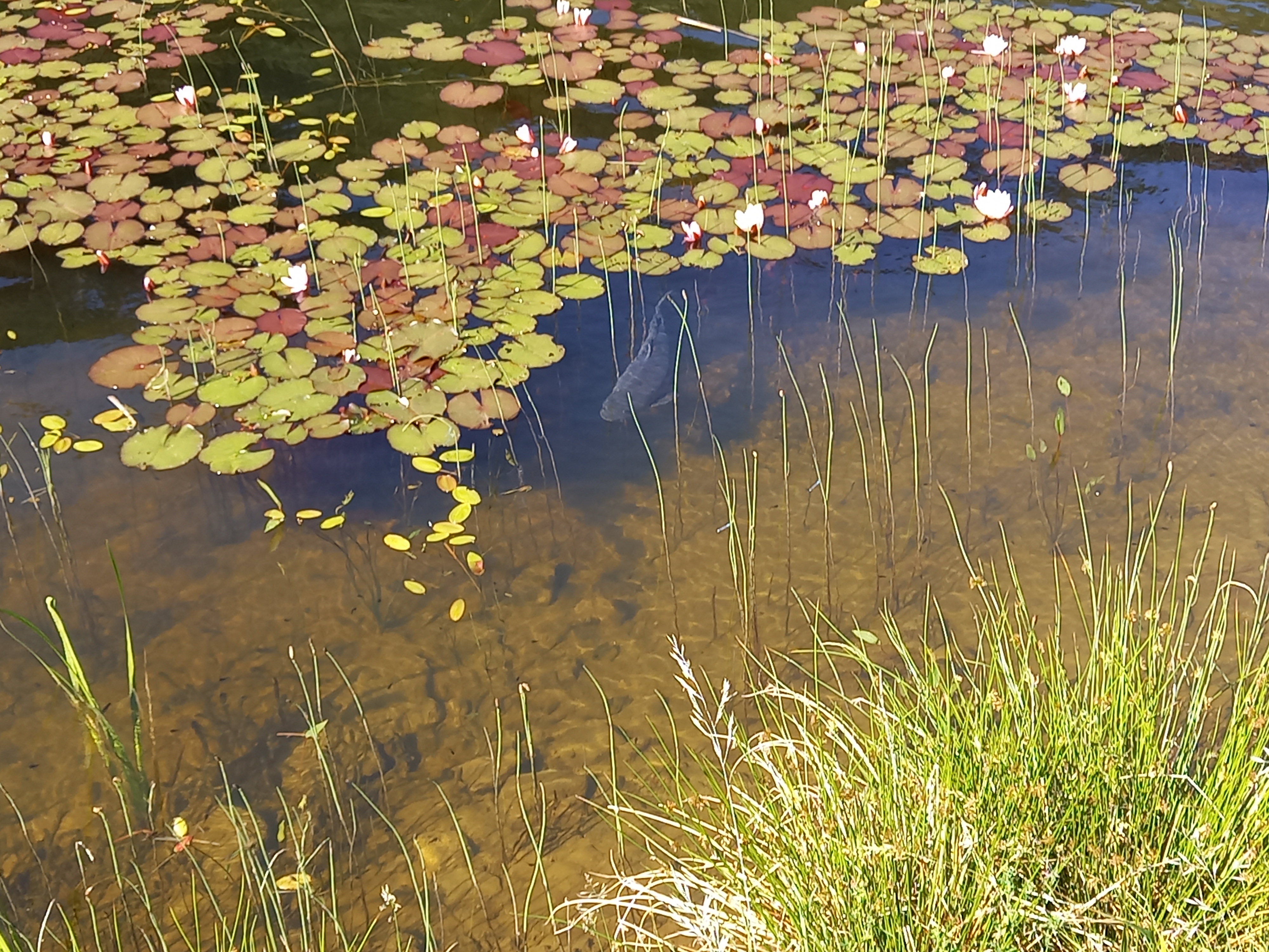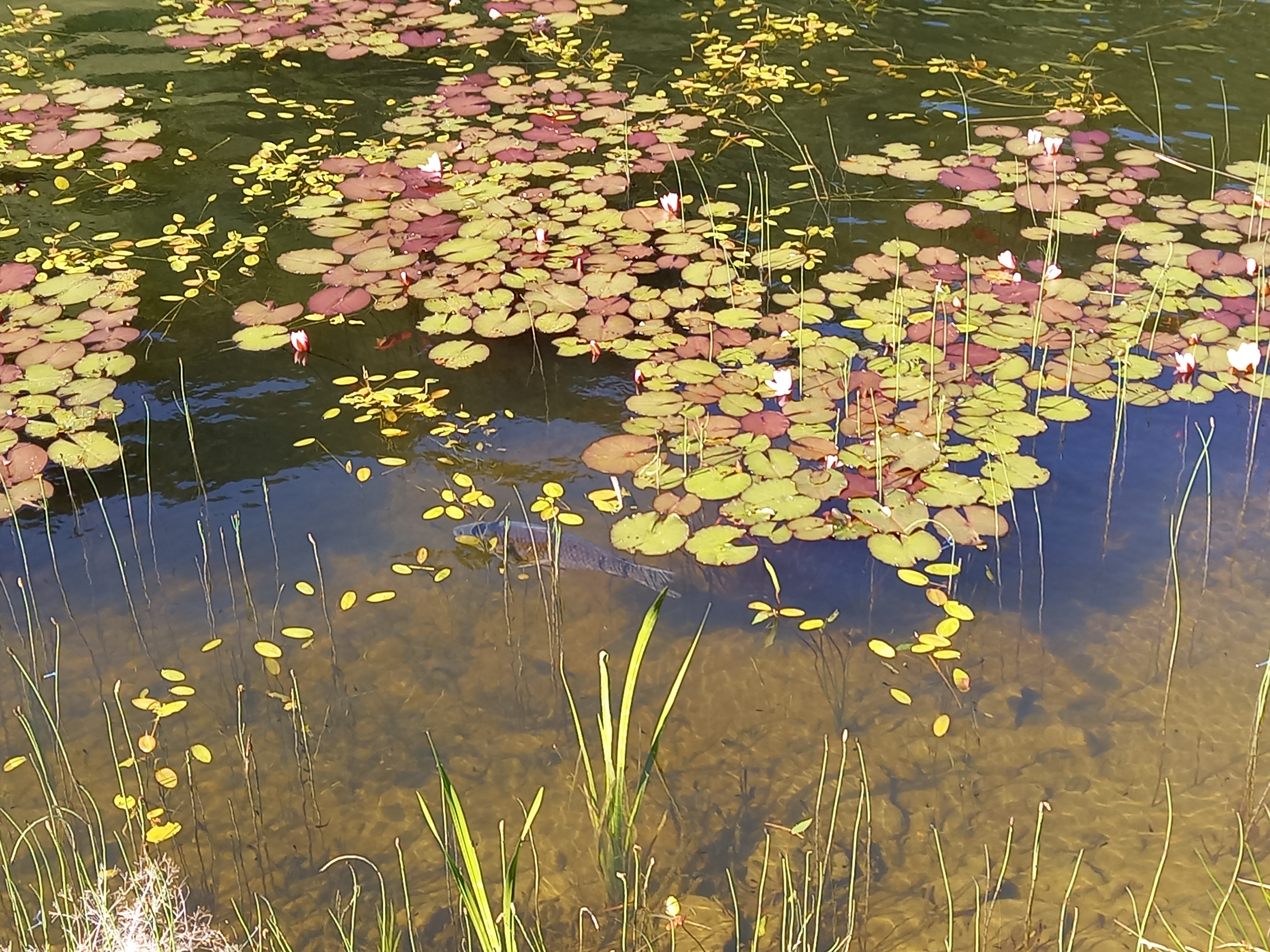 A tó meglepően meleg volt, a völgyszél pedig hűvös. Úgy tűnt, hogy a tavat a békák is szeretik :) Életemben nem láttam ennyi ebihalat! És nem csak a szélső, sekély részeken, hanem a mélyebben is. Még a tó közepén is tömegével voltak. És ellentétben a halakkal, ezek nem hussannak szét előtted. Úszás közben minden karmozdulattal jópár ebihalba ütköztem. Hát, elég fura volt. Sajnos a búvárszemüveget otthon hagytam, pedig gyönyörű tiszta volt a víz. Leszáradásképp sétáltam kicsit a tó körül. Virágoztak a tavirózsák, sőt, néhány mocsári nőszirom is volt még :) Meg tavi hídőr. Egy szép nagy halat is láttam köztük. (Nem pisztráng volt, de én nem ismertem föl…)