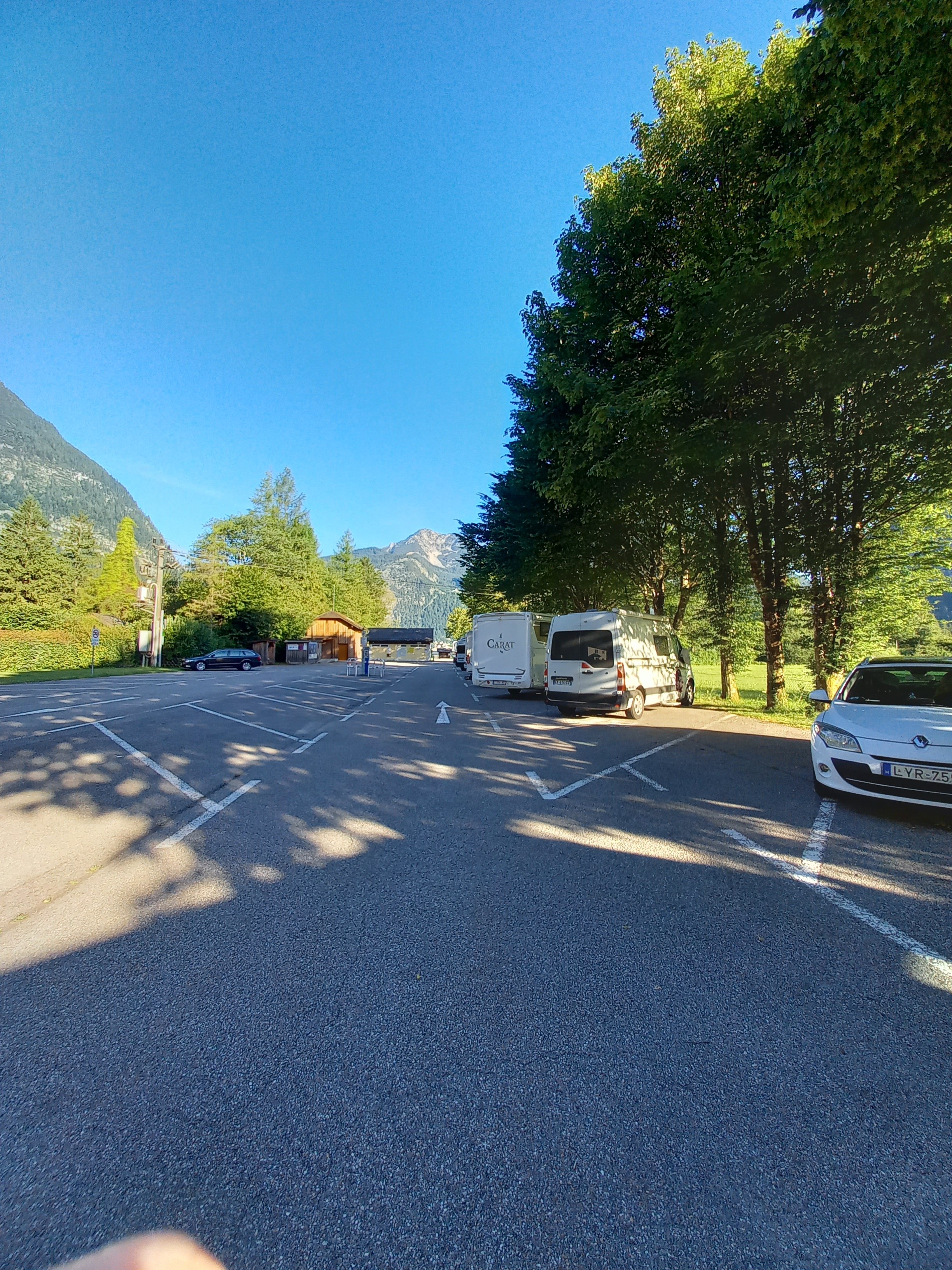 Elkeseredve indultam vissza a Grimming felé. Obertraunban, a P4 tábla mellé azt írták, hogy öffentliches Badestrand mit FKK Bereich :) Hát, ezt meg kellett néznem. Pár lakóautón kívül üres volt a parkoló. Átgyalogoltam a legtávolabbi sarokba, és levetkőztem. A szomszéd strandrész felől sövény és kerítés választott el, de Hallstattból közvetlenül át lehetett látni.